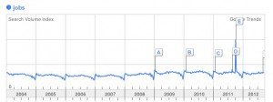 W czwartek ukaże się mój cotygodniowy felieton w Dzienniku Gazecie Prawnej, w którym podsumowuję ostatnie informacje ekonomiczne. Już dawno takiego nasilenia złych wiadomości, można popaść w depresję. Poniżej fragment felietonu i wykres z google trends pokazujący, że globalnie ludzie coraz część szukają hasła “jobs”, czyli praca, to jest już trend długookresowy, bardzo niepokojący. Ten wyskok rok temu, to śmierć znanego biznesmena a takim samym nazwisku.